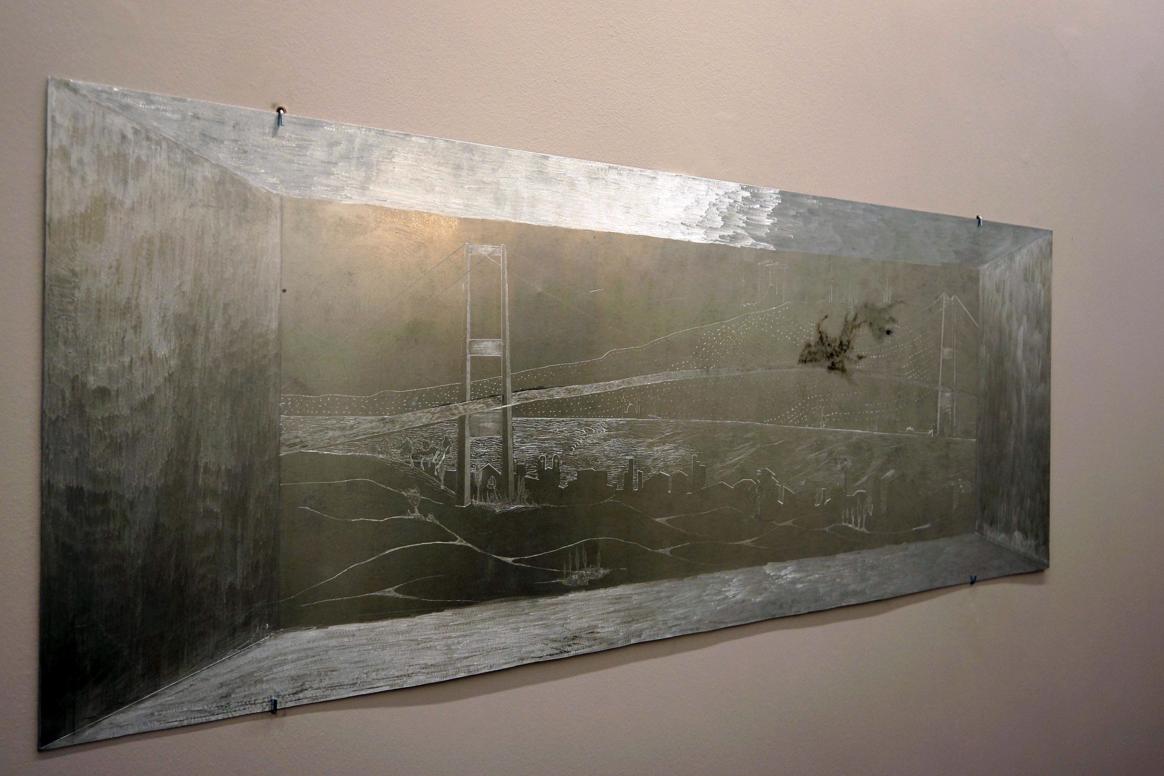 The frame of the work provides a perspective that makes us feel as if we are viewing the painting from inside a box or bunker. Inside the frame, a view can be seen. It is more or less like a view of the Bosphorus Bridge, Istanbul from the hilltops of Ortaköy. This was the view from where I live. It could easily have been a postcard. There is a strange blemish on the Bridge.